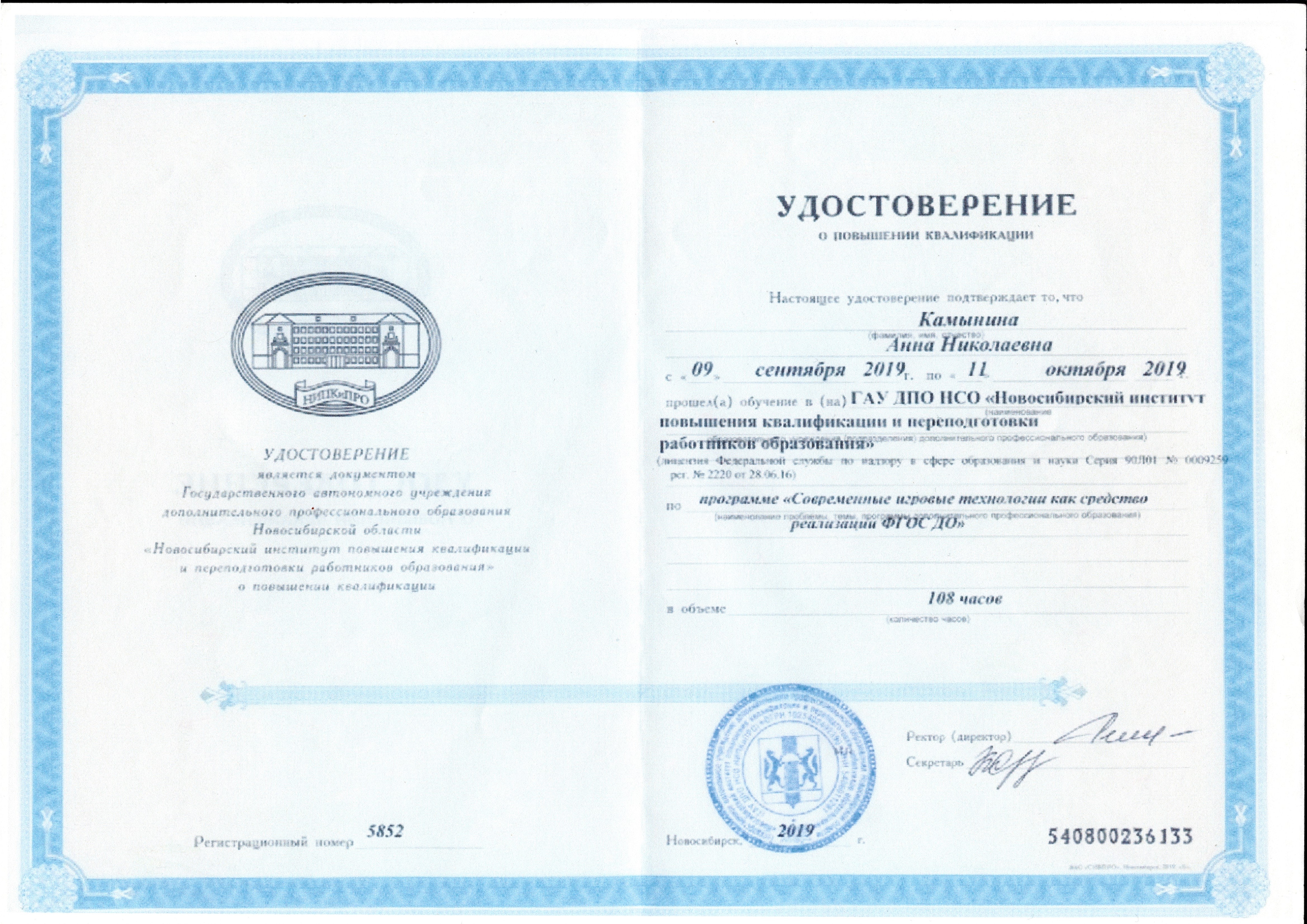 (Государственное автономное образовательное учреждение дополнительного профессионального образования Новосибирской области "Новосибирский институт повышения квалификации и переподготовки работников образования". 108часов. Форма обучения: Очно - заочно.).